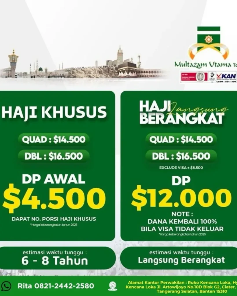Multazam, sudah dipercaya selama puluhan tahun memberangkatkan ribuan jamaah haji khusus dan furoda. Kami berkomitmen memberikan layanan terbaik yang sesuai syariat dan penuh keberkahan.
